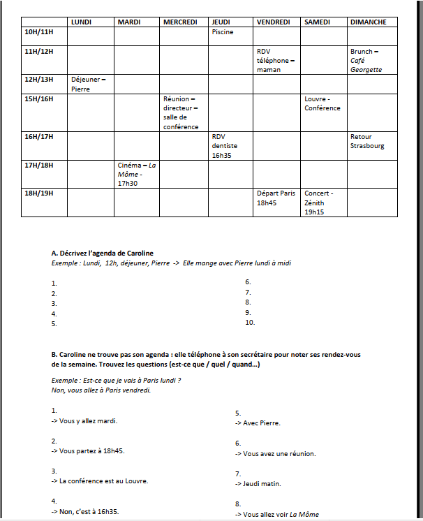 Activité en petits groupes : un étudiant fait son emploi du temps, l’autre pose des questions « Qu’est-ce que tu fais le lundi à midi ? », ou bien le commente « Tu vas à la piscine… » et ils peuvent comparer leurs emplois du temps. « Je vais à la piscine mais tu manges à la cantine. »