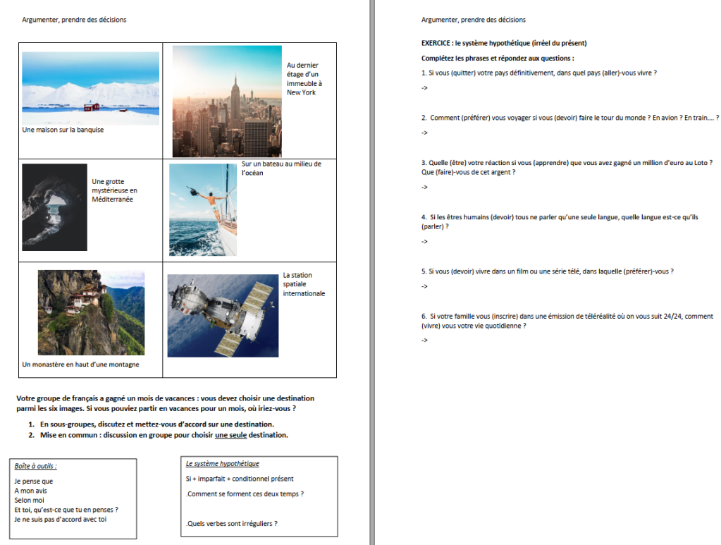 Objectifs : Prendre une décision en groupe, arriver à un compromis. A partir de six destinations différentes (et un peu originales) on demande aux apprenants (en groupe ou en particulier, dans ce cas l’enseignant peut débattre et n’être pas d’accord ) de prendre une décision sur un voyage. Si les apprenants n’ont pas d’idées d’arguments on peut les guider sur les activités à faire, la météo, la difficulté d’y arriver ou de se déplacer…