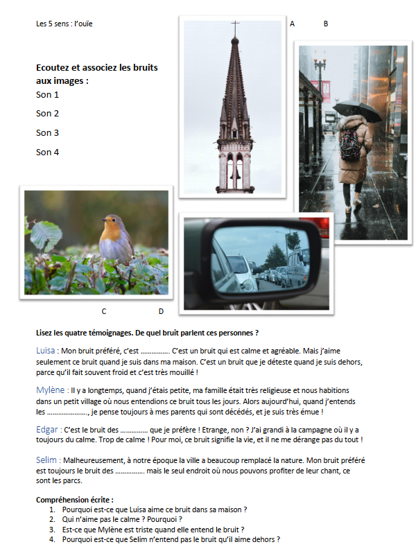 Depuis 2018, la banque de sons de la BBC propose des effets et sons enregistrés libres de droits pour un usage non-commercial, et j’en ai profité pour créer une fiche de cours consacrée à l’ouïe, partant de l’identification de 4 sons : la pluie qui tombe, une voiture qui roule, les cloches sonnantes d’une église et un oiseau qui chante. En partant d’une sensation du type « j’entends X », il est très intéressant de parler de ses goûts, et du monde sonore qui nous entoure et qui est souvent ignoré!