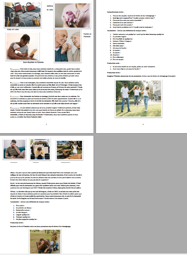 Objectifs : Pour la Saint-Valentin, mais aussi évidemment pour toute l’année, parlons d’amour ! Quatre témoignages de couples différentes permettront aux apprenants de parler de leurs relations, de comment elles s’expriment (en actes, en paroles) comment elles se créent et se développent.