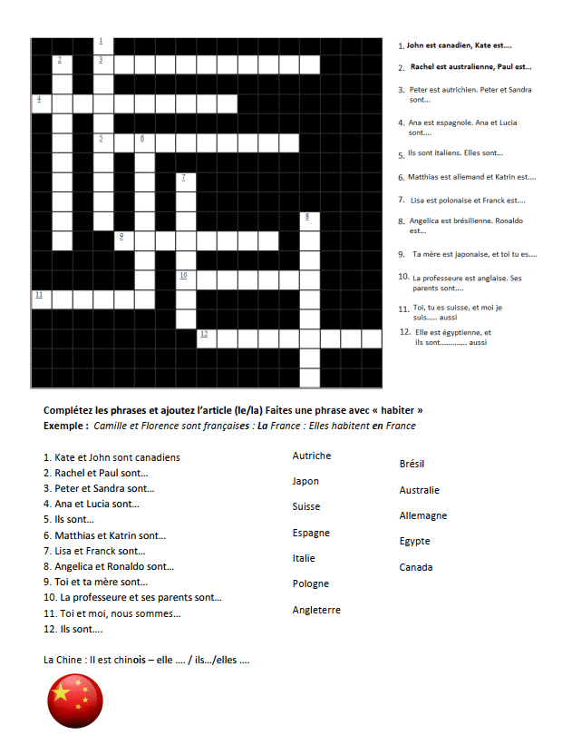 Objectifs: En lien avec cette fiche, voici une fiche pédagogique assez ludique pour réutiliser le lexique qui aura été vu sur les nationalités et comment décrire la nationalité d’une ou plusieurs personnes. Des mots croisés où il faut retrouver la nationalité à partir d’un changement de genre.