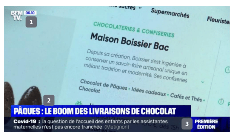 A partir d’une capture d’écran, on décrypte la construction de la chaîne d’information avec les trois parties principales (logo, titre, bandeau défilant) puis on peut détailler, demander à quoi cela sert et on peut demander s’ils connaissent, quel type de chaîne c’est (infos en continu, national) avant de se pencher sur l’illustration ( site internet, chocolat) et le lien avec le titre (Pâques: quand, où, quoi…)