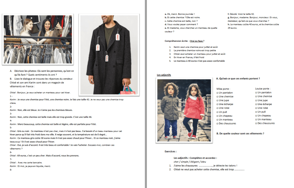 Dans cette fiche, je propose un dialogue à compléter entre deux clients et un vendeur, où les réponses du vendeur sont à ajouter. Pour commencer, on décrira les photographies, ce qui permettra de développer le vocabulaire des vêtements.
