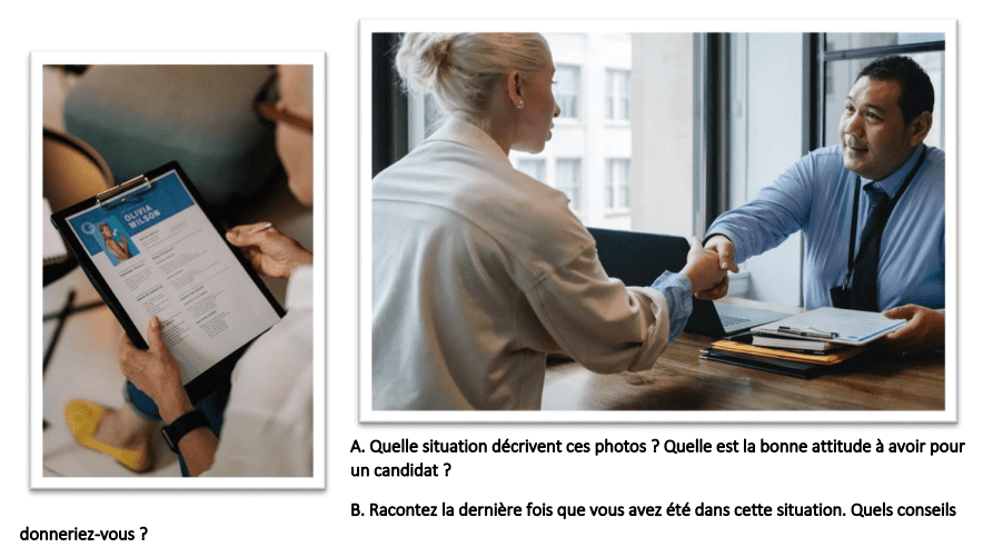 Pour aller plus loin : Bien sûr, réaliser un entretien d’embauche à deux, mais surtout donner des conseils sur une série de problématiques différentes avec le modèle « à faire » / « à ne pas faire ». Demander aux apprenants de donner un sujet à d’autres sous-groupes par exemple.