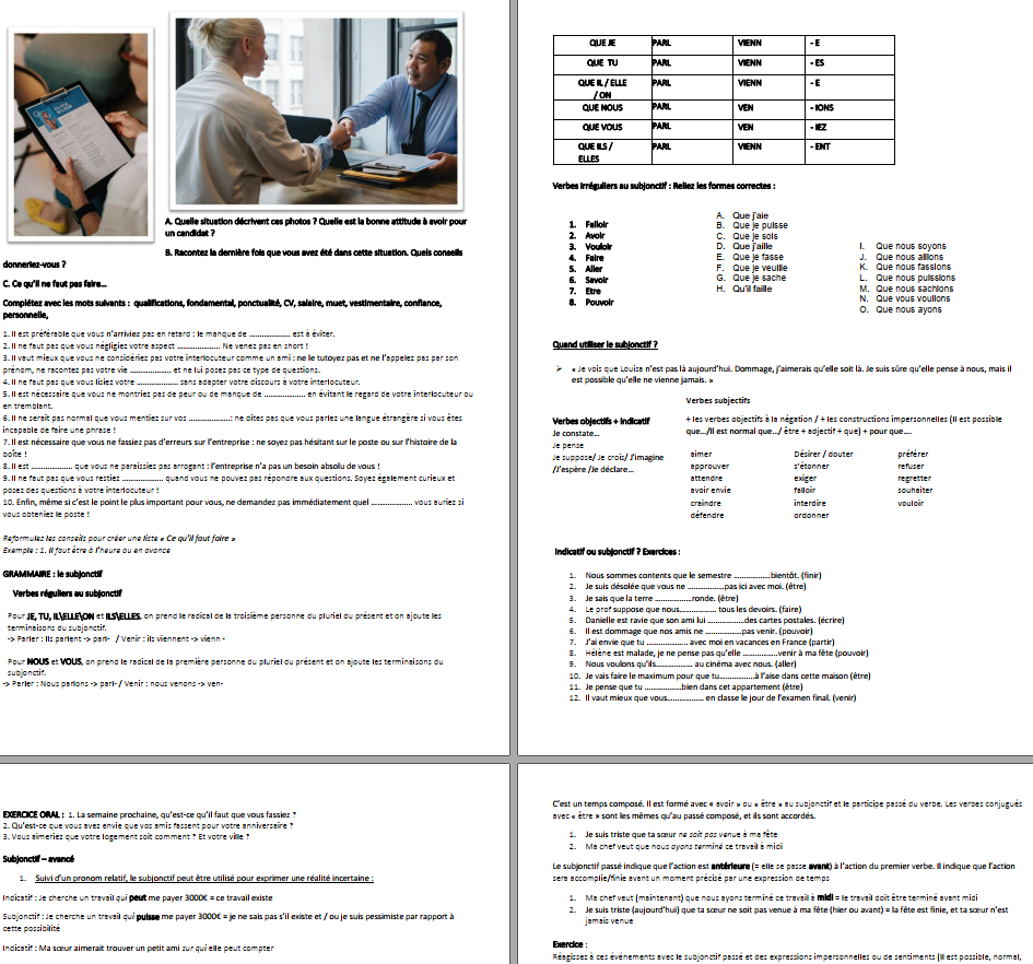 La fiche est clé-en-mains, avec l’explication grammaticale, les verbes irréguliers, un exercice de différence avec l’indicatif, ainsi qu’un approfondissement que vous pourrez laisser de côté sur le subjonctif en proposition relative (avec qui) et le subjonctif passé.