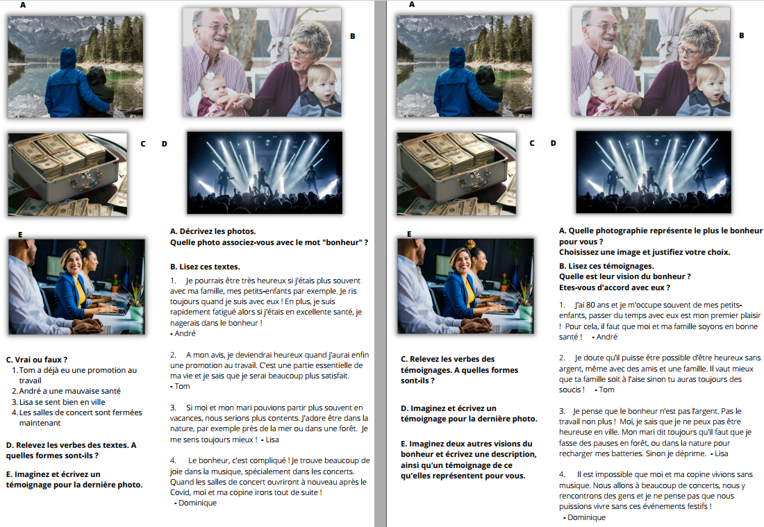 Pour tous les niveaux, il est intéressant de discuter du bonheur avant/aprés le Covid qui est mentionné dans un témoignage dans la fiche A2/B1 : un tel événement a-t-il pu faire changer notre vision du bonheur? Le simplifier? L’étendre?