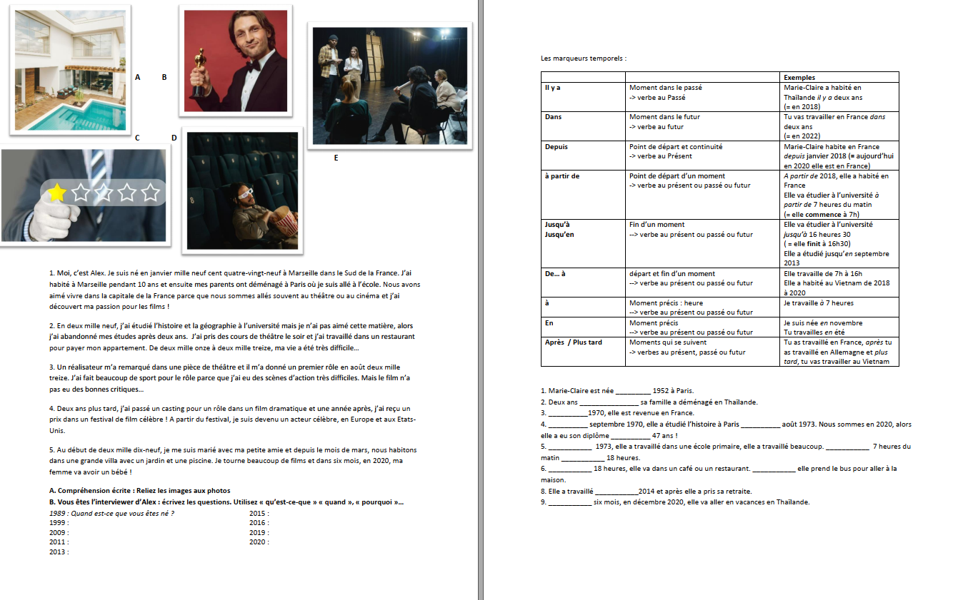 Objectifs: Une interview reconstituée d’un acteur fictionnel qui raconte sa vie permet de réviser ou de découvrir les marqueurs temporels, et la chronologie au passé mais aussi au présent et au futur (proche). Beaucoup de petits mots, beaucoup de dates à détailler en mini-groupes pour plus de clarté. Le texte est dans l’ordre et raccrocher les paragraphes aux images permettra de vérifier la compréhension des apprenants, en demandant quel détail les photos décrivent. Par exemple la photo C illustrant le paragraphe 3 se concentre sur les « mauvaises critiques » du premier film d’Alex.
