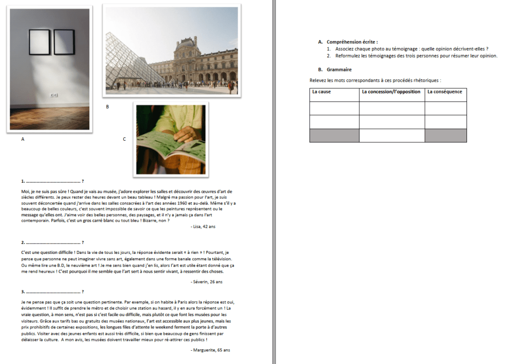 On pourra commencer par la même question dans la fiche précédente, sur ce que représente l’art et la culture pour les apprenants. Existe-t-il une bonne ou une mauvaise culture ? Puis, on fera lire trois témoignages pour trouver les trois questions qui ont été posées.