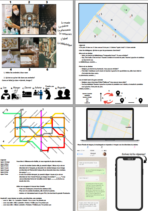 La page 4 est un recap pour que l’apprenant réutilise tout cela avec la lecture et la réponse à un message de Whatsapp (fictif aussi) avec deux lieux à cibler sur la photo, et une direction à donner.