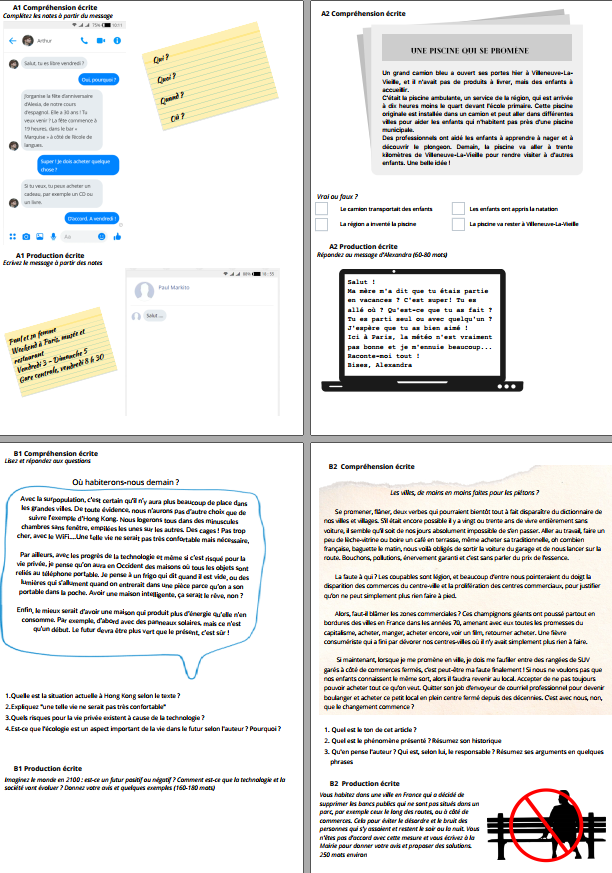 B1 la compréhension écrite est plus longue, plus complexe, sur un sujet informatif présentant des opinions et contenant des temps verbaux plus difficiles comme le conditionnel, le futur, ainsiq qu’un vocabulaire plus spécialisé (la technologie, le logement) et des phrases plus longues. Les questions sont aussi plus difficiles, plus ouvertes et on s’attend à des phrases qui ne sont pas des copier-coller. Pareillement pour la PE, le sujet demande des verbes au futur/conditionnel et des opinions. Ce sujet reste toutefois assez vague pour qu’un étudiant A2 ou début B1 puisse s’y atteler et ne pas juste rester bloqué !