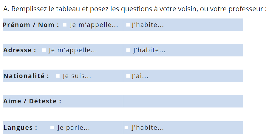 Je vous propose aussi une fiche « variation » avec deux choix pour chaque proposition, et sans la question de l’âge pour éviter les chiffres, si vous avez un groupe ou un apprenant qui aurait besoin d’être plus guidé: