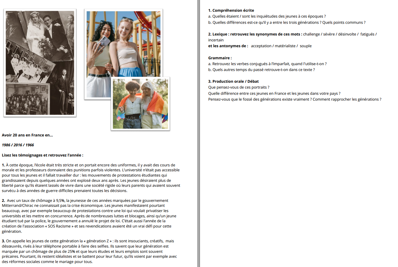 Pour aller plus loin : À l’oral, on s’attachera à creuser ce qui fait une génération, ce qui définit la jeunesse, quels points communs, quelles différences, surtout selon les pays d’origine des apprenants et si leur culture leur donne même cette notion de génération englobante. On pourra faire une frise pour différencer ces générations par exemple, avec des événements majeurs qui marquent ces générations.