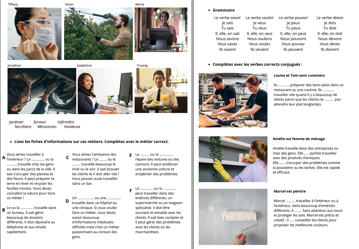 Grammaire : Le féminin/masculin des métiers, quelques adjectifs, les verbes « savoir », « pouvoir », « vouloir » et « devoir ».
