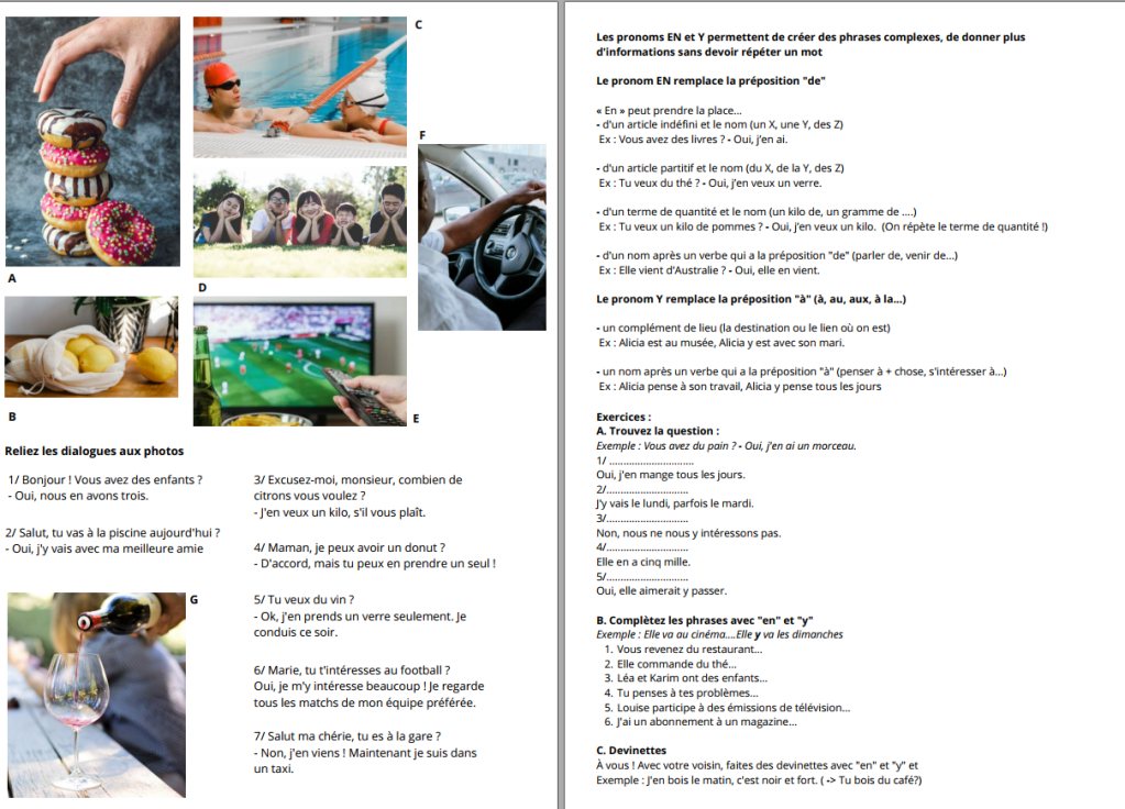 Aujourd’hui je vous présente une fiche axée grammaire sur le thème des pronoms objets « en » et « y », un thème qui revient assez souvent dans les difficultés des apprenants, parfois dès le niveau A1 (mais je classifie ma fiche en A2, car malgré la simplicité de l’exercice, les nuances peuvent être difficiles et ne sont pas très utiles en A1.)