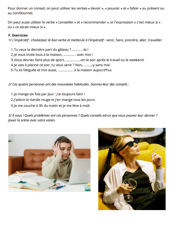 Un exercice de production flexible oral ou écrit avec 3 problèmes bien définis vont aider l’apprenant à commencer à donner des conseils, peut-être juste en une phrase. Et enfin, un dernier exercice avec 2 photos va demander aux apprenants d’imaginer les problèmes, de les mettre en mots, et aussi d’y trouver des solutions/conseils.