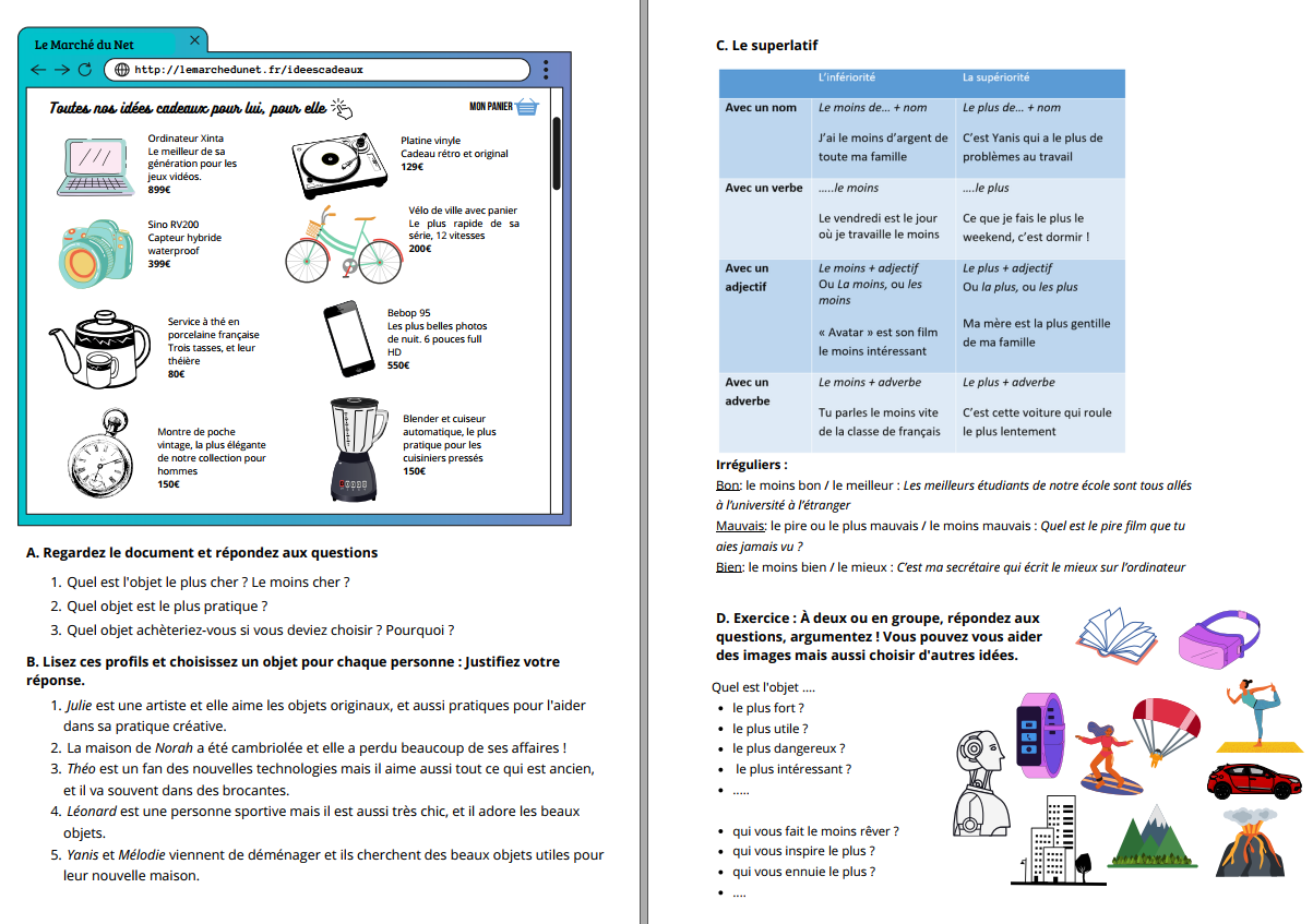 Activité A : des questions de compréhension qui révisent le comparatif avec des réponses attendues qui peuvent être objectives, comme « Le blender est aussi cher que la montre », mais aussi subjectives « à mon avis, le vélo est plus pratique que l’ordinateur » où on attend une petite explication d’opinion (« Pourquoi? » « Parce que je peux aller au travail avec mon vélo », etc). Les questions sont formulées avec le superlatif, qui est bien assez proche du comparatif pour que les apprenants puissent les comprendre et y répondre, mais essayez de les guider vers des réponses au comparatif. La dernière question est une introduction à l’activité suivante, n’hésitez pas à pousser un peu si vos étudiants pensent que tout est inutile ou trop cher ! Comme la question est au conditionnel, c’est purement théorique !