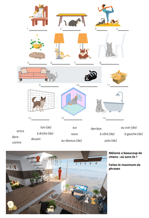 Cette fiche peut être donnée en complément dans la séquence, ou bien en aide supplémentaire car elle contient plus de prépositions que la fiche principale, et elle n’a pas d’activités de CO/CE, uniquement une association de mots et un PO ou PE pour appliquer ces nouveaux mots.