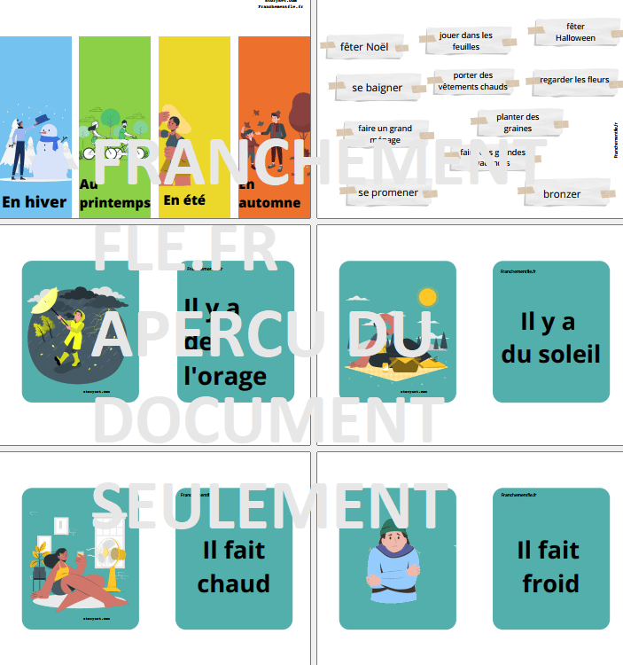 Page 1 : Glisser-déposer des activités des saisons. On sélectionne les étiquettes (sans cliquer) pour faire glisser sur la boîte. Bien sûr, plusieurs réponses sont possibles mais une solution est proposée en page 2 : elle apparaît quand on clique sur les « doigts » interactifs près des boîtes. En groupe en écran partagé, on profitera de ce moment pour discuter boîte après boîte : est-ce que les apprenants font aussi cela ? Est-ce selon eux la bonne saison pour cette activité ?