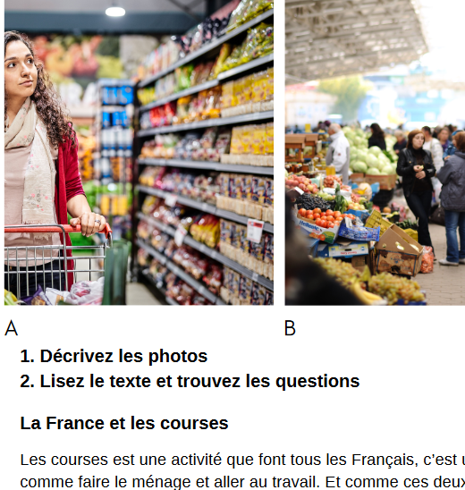 Activité 1 : décrire les photos et 3 modes de courses différents (le supermarché, le marché et la livraison à domicile). Demandez à vos apprenants qui fait comment ses courses, comment, et aussi pourquoi tel moyen est plus ou moins pratique pour eux.